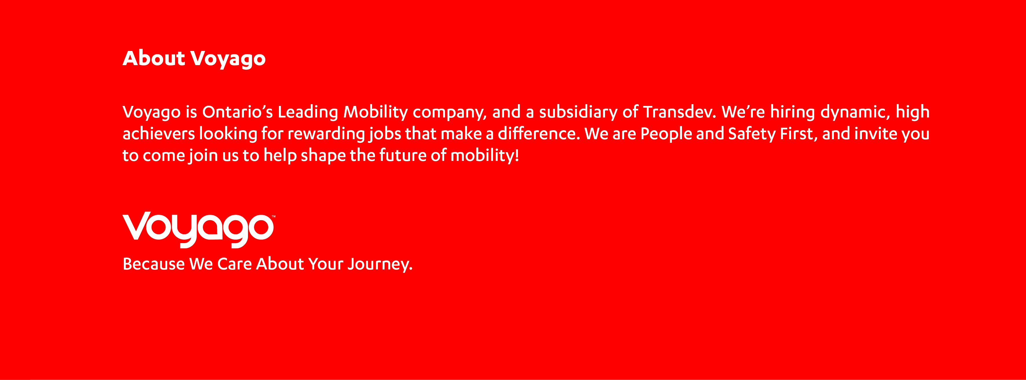 Voyago is Ontario's Mobility brand and a subsidiary of Transdev, an international leader in mobility at the service of communities. Voyago provides safe reliable transportation to Ontario's Hospitals, Schools, and Community Transit systems.